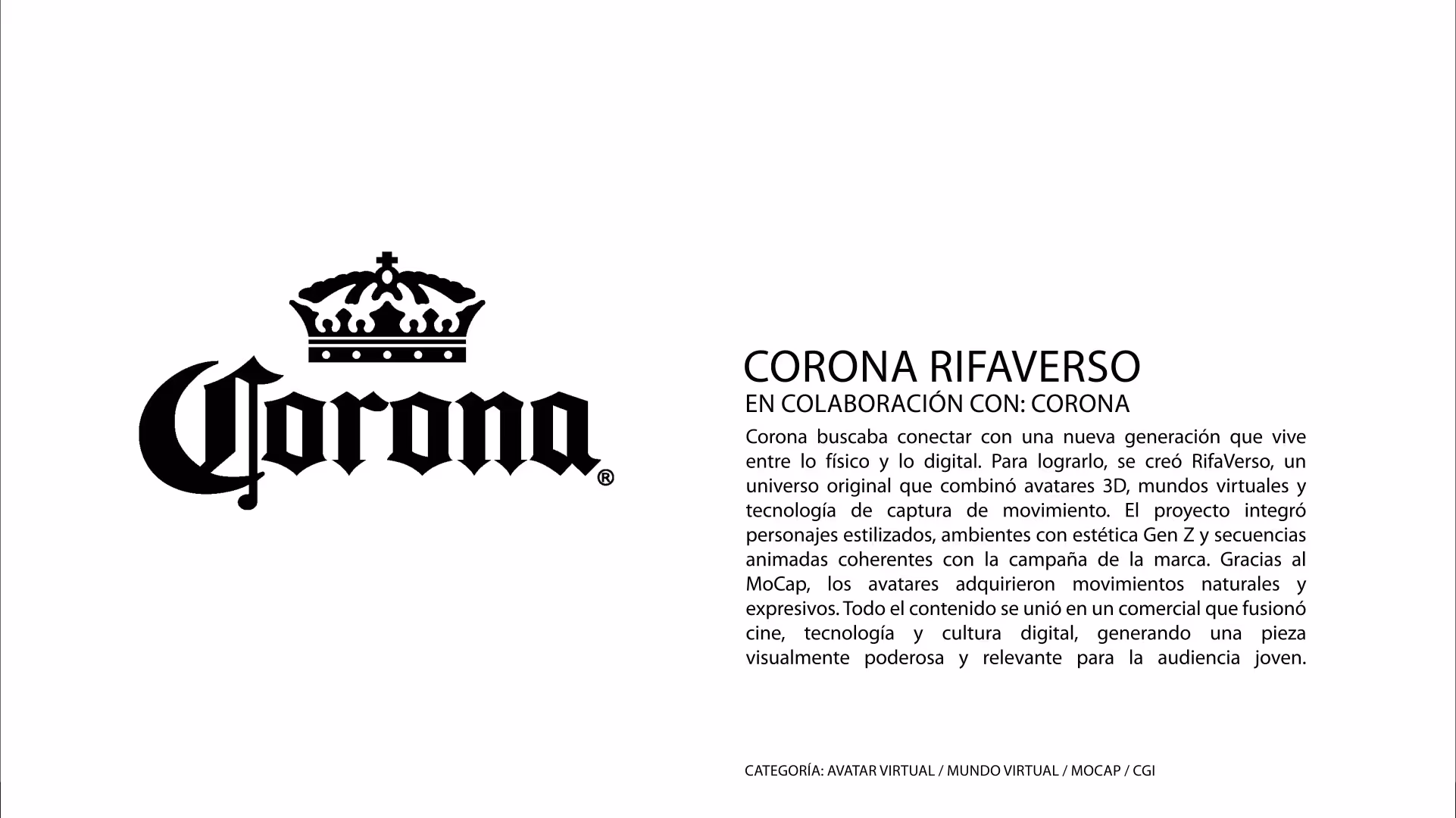Rifaverso expanded Corona’s universe into contemporary digital language to connect with Gen Z. We developed 3D avatars, virtual worlds, and Motion Capture workflows integrated directly into the final commercial—building a cohesive ecosystem aligned with the brand’s cultural and visual identity. This physical-digital convergence unlocked new storytelling and presence. The result: an innovative campaign positioning Corona as culturally relevant and forward-thinking for connected audiences.