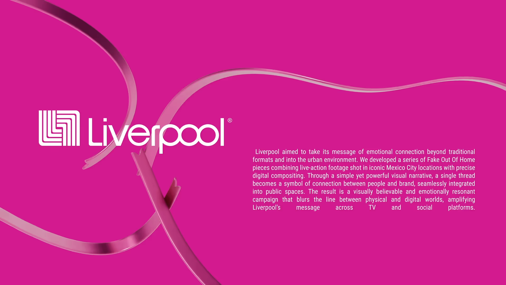 Liverpool aimed to take its message of emotional connection beyond traditional formats and into the urban environment. We developed a series of Fake Out Of Home pieces combining live-action footage shot in iconic Mexico City locations with precise digital compositing. Through a simple yet powerful visual narrative, a single thread becomes a symbol of connection between people and brand, seamlessly integrated into public spaces. The result is a visually believable and emotionally resonant campaign that blurs the line between physical and digital worlds, amplifying Liverpool’s message across TV and social platforms.
